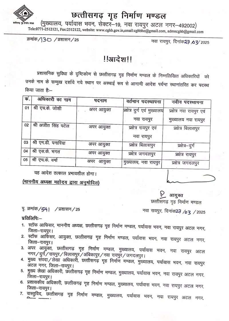 हाउसिंग बोर्ड के अधिकारियों के तबादले: लंबे समय से जमे अधिकारियों के तबादला, आदेश जारी