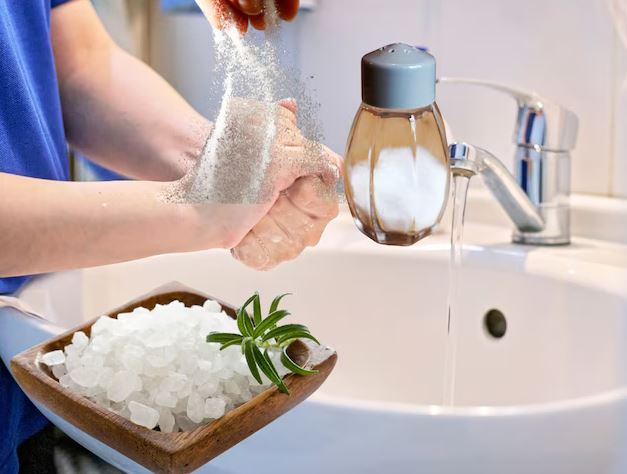 सबसे पहले आप अपने रसोईघर में जाएं और डिब्बे में से दो या तीन चम्मच नमक निकाल लें. उसे अपनी हथेली के बीचोबीच रखें. फिर नल को इस तरह से खोलें कि उसका पानी धीमी गति से गिरे. अब आप उस पानी और नमक से अपनी दोनों हथेली को अच्छे से धोएं. धीमी गति से अपनी दोनों हथेली को आपस में रगड़ें ताकि नमक पानी के साथ अच्छे से घुल जाए और चारों ओर लग जाए. नमक से हाथ धोने के बाद अपनी हथेली को सूखा लें.