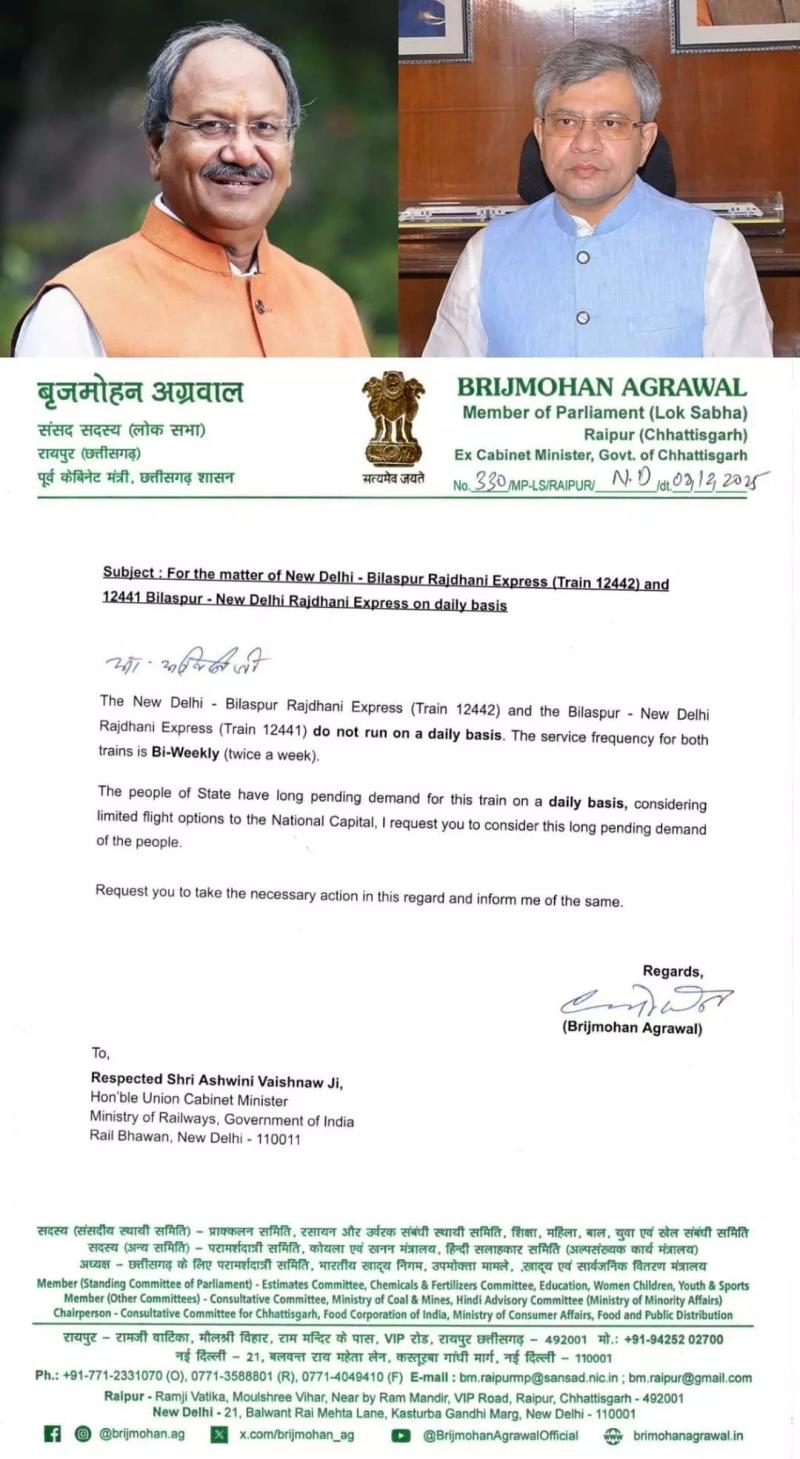 रायपुर। छत्तीसगढ़ की राजधानी और उत्तर भारत के बीच बेहतर रेल कनेक्टिविटी सुनिश्चित करने के उद्देश्य से बिलासपुर–नई दिल्ली राजधानी एक्सप्रेस (12441/12442) को प्रतिदिन संचालित करने की मांग की गई है। इस संबंध में संसद भवन में केंद्रीय रेल मंत्री अश्विनी वैष्णव से औपचारिक मुलाकात कर प्रदेश की महत्वपूर्ण रेल आवश्यकताओं पर चर्चा की गई।