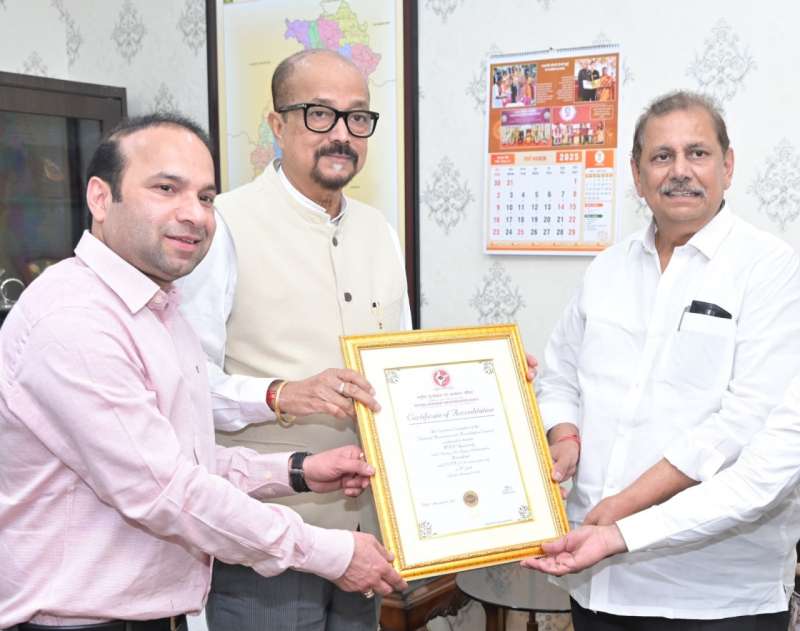 रायपुर : राज्यपाल रमेन डेका से आज यहां राजभवन में मैट्स यूनिवर्सिटी रायपुर के कुलाधिपति गजराज पगारिया ने भेंट की। राज्यपाल डेका ने विश्वविद्यालय को नैक से ए प्लस ग्रेड मिलने पर शुभकामनाएं दी और इसी तरह आगे भी विश्वविद्यालय की गुणवत्ता बनाये रखने कहा। इस अवसर पर विश्वविद्यालय के कुलपति के. पी. यादव भी उपस्थित थे।