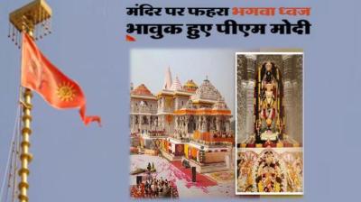 अयोध्या राम मंदिर में ध्वजारोहण पूरा हुआ। पीएम मोदी के बटन दबाते ही झंडा धीरे-धीरे ऊपर चढ़ता हुआ मंदिर के शीर्ष पर विराजमान हो गया। जैसे-जैसे झंडा ऊपर चढ़ता गया...